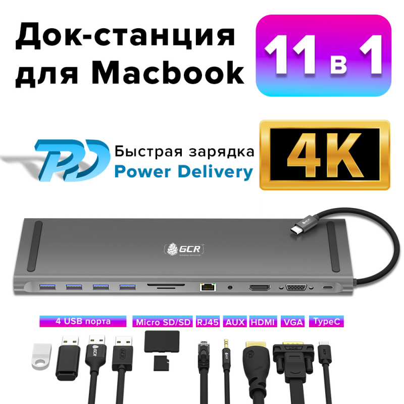 USB разветвитель и HUB 11 в 1 для MacBook решит проблему подключения телевизора, монитора, проектора и периферийных устройств к ноутбуку с разъемом Type C. Док-станция 11 в 1 оснащена четырьмя USB портами, разъемом Type C с поддержкой Power Delivery, RJ45 + VGA + HDMI разъемами, слотами для MicroSD/SD карт и аудио-выходом для наушников.
