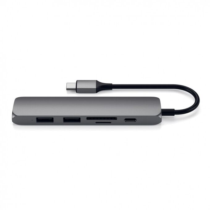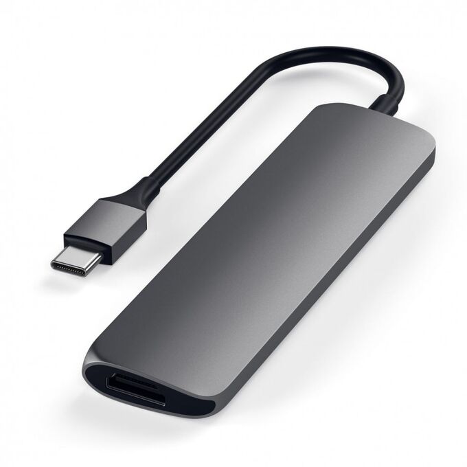 Переходник Satechi Slim Aluminum Type-C Multi-Port Adapter V2 объединяет в себе прекрасный функционал и тонкий, обтекаемый дизайн. Он позволяет подключать к MacBook c портом USB-C множество различных устройств, при этом благодаря сквозному порту Type-C ваш лэптоп не останется без подзарядки. С данным переходником пользователи MacBook могут вздохнуть с облегчением. Теперь в вашем распоряжении будет два порта USB 3.0, порт 4K HDMI и картридер. Оба порта USB могут служить для подключения портативных устройств, таких как камера, плеер, флеш-накопитель, кабель для синхронизации смартфона и многое другое.