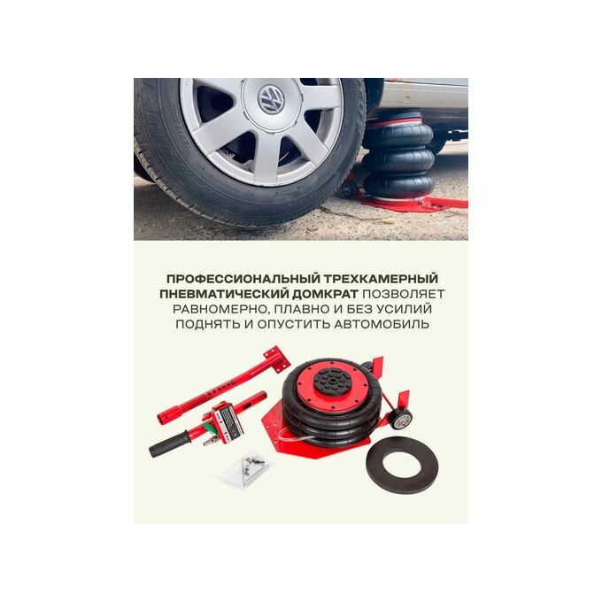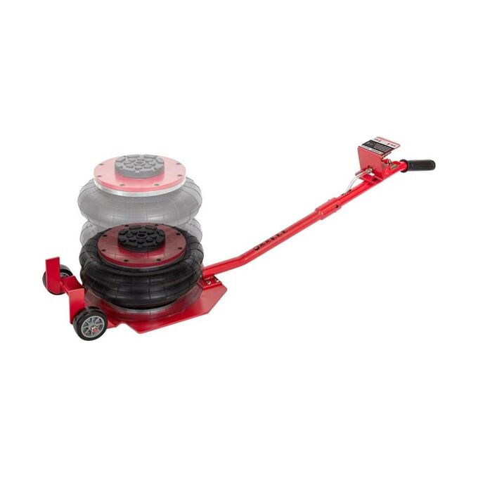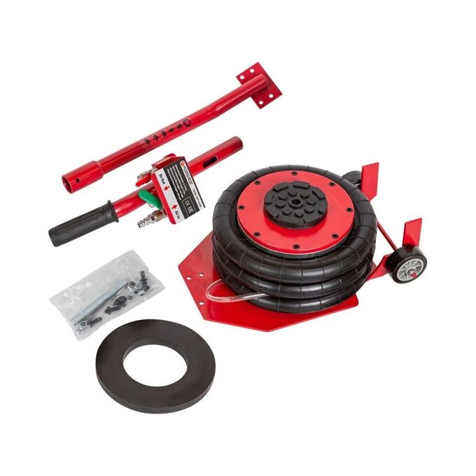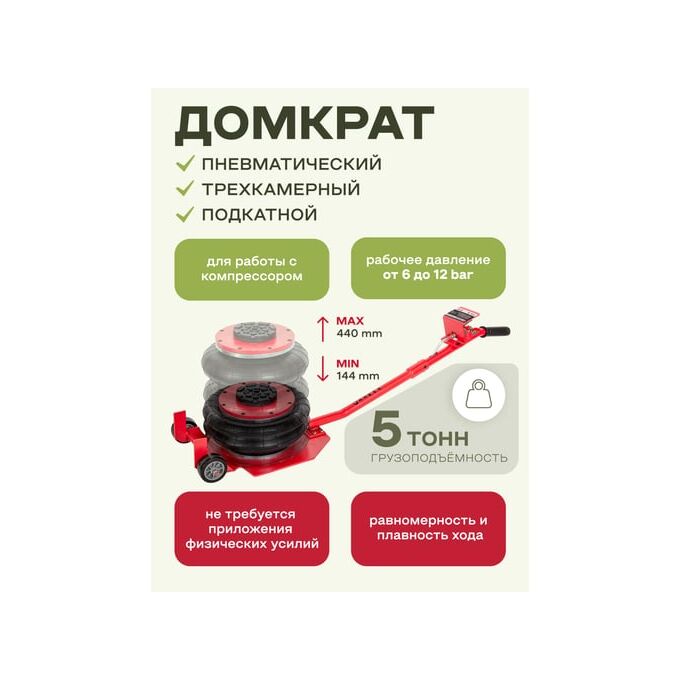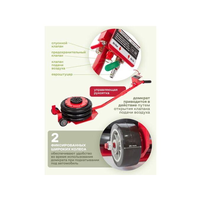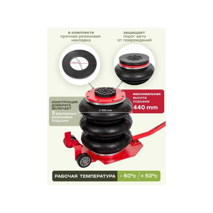 Продуманность конструкции. Подкатной домкрат имеет грузоподъемность 5 тонн и рассчитан на подключение к компрессору, подающему сжатый воздух под давлением от 6 до 12 бар. Устройство приводится в действие путем открытия крана подачи, расположенного на конце управляющей рукоятки. Конструкция данной модели включает три распорные резиновые подушки диаметром 270 мм.