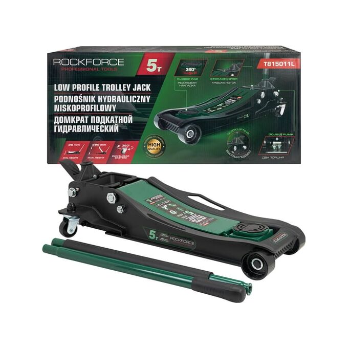 Подкатной домкрат Rockforce — это высококачественное и надежное оборудование, предназначенное для подъема автомобилей в автосервисах, шиномонтажных центрах и гаражах. Он идеально подходит для автомобилей с низким клиренсом, обеспечивая удобство и безопасность при работе.