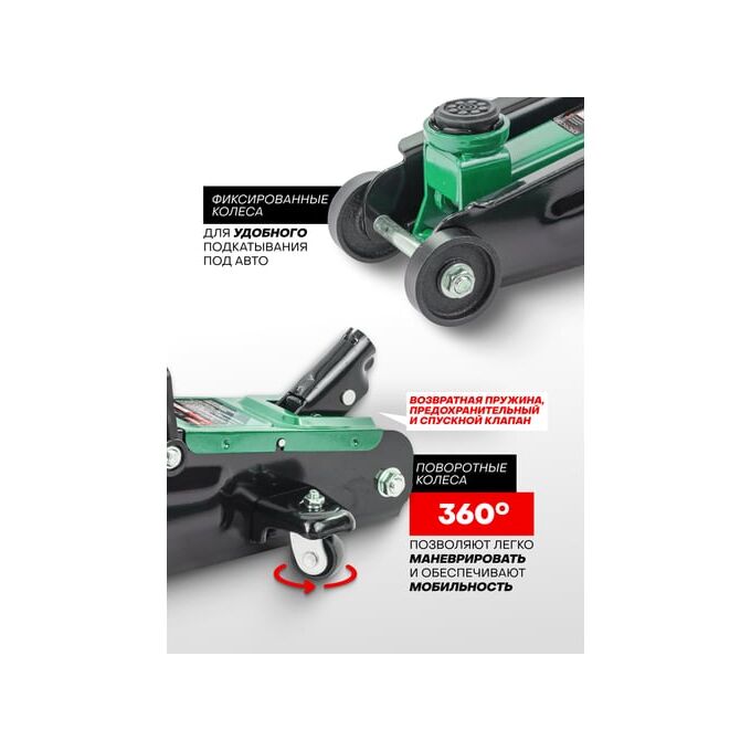 Продуманность конструкции. Подкатной домкрат обеспечивает высоту подъема 380 мм., высоту подхвата 130 мм. Рассчитан на грузоподъемность до 2 тонн. Прорезиненный наконечник на рукоятке, обеспечивает надежный хват даже в перчатках. Домкрат оснащен специальным предохранительным и спускным клапаном для защиты от перегрузки, позволяет плавно без усилий опустить домкрат. Профилированная рукоятка позволяет удобно транспортировать домкрат до места ремонта.