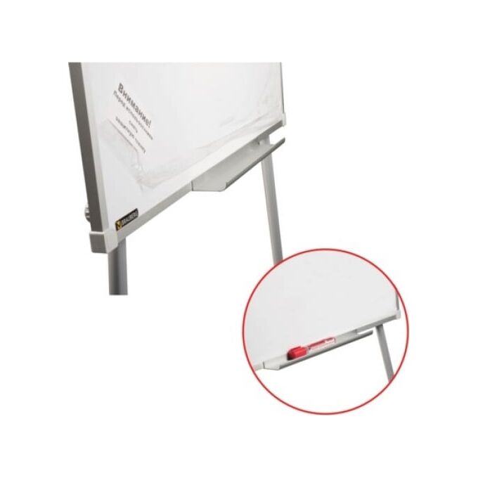 Снабжена полочкой для аксессуаров. Для защиты рабочей поверхности доски на нее нанесена защитная пленка. Перед началом работы необходимо удалить защитную пленку. При должном уходе за рабочей поверхностью при помощи чистящей жидкости-спрея и стирателей BRAUBERG поверхность доски-флипчарта прослужит более 10 лет.
