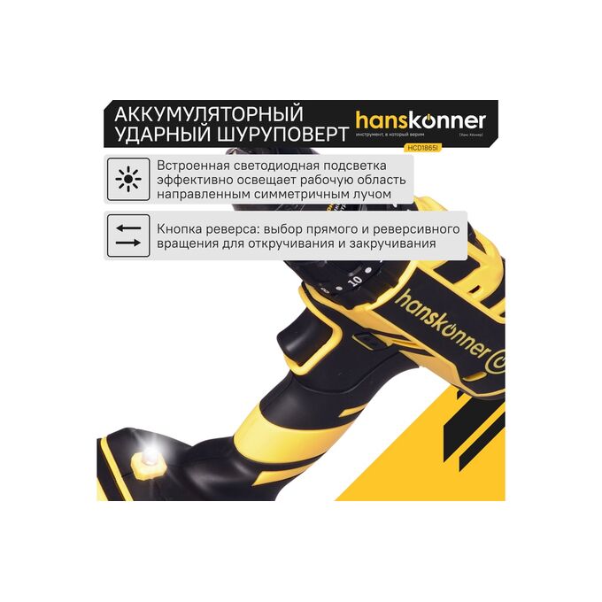 Аккумуляторная бесщеточная ударная дрель-шуруповерт Hanskonner HCD1865I подходит для любых работ, в том числе в стесненных условиях и труднодоступных местах без снижения производительности и потери качества работ.