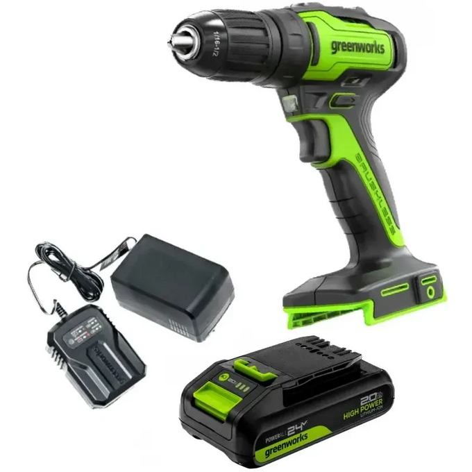 Дрель-шуруповерт Greenworks GD24DD35 (3704007CUA) аккумуляторная, 24V, б/щет, 29/35Нм, 1х2Ач, ЗУ, кор