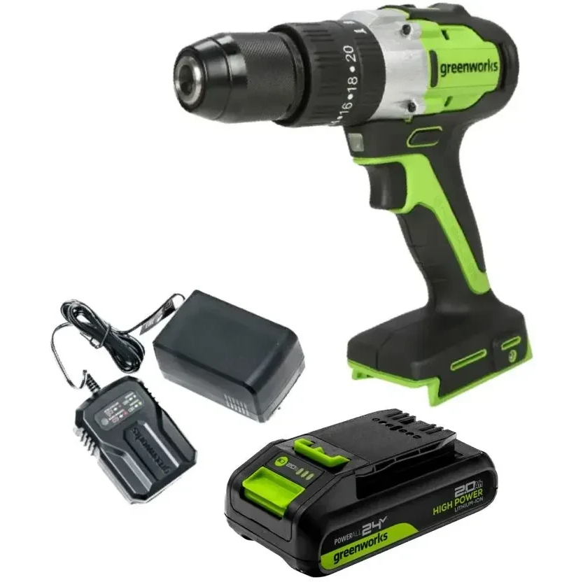 Дрель-шуруповерт Greenworks GD24DD60 (3704107CUA) ударная аккумуляторная, 24V, бесщеточная, 30/60Нм, 1х2Ач, ЗУ, кор