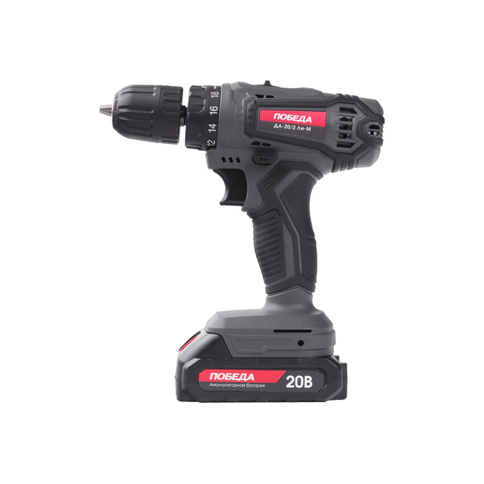 Дрель-шуруповерт Победа ДА-20/2 Ли-М (180201702), 20В, 2,0Ач, 2 АКБ+ЗУ, 38Нм, кейс, комплект сверл и бит