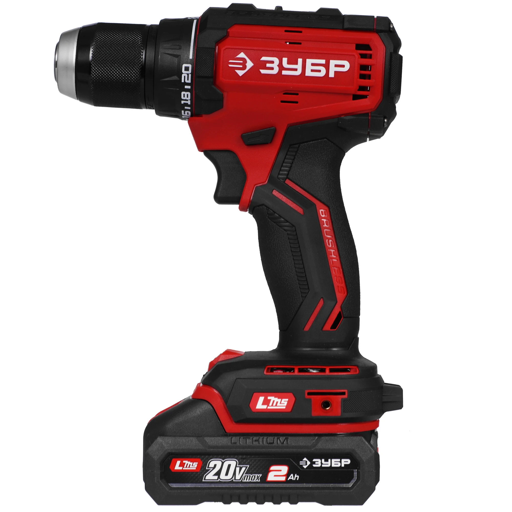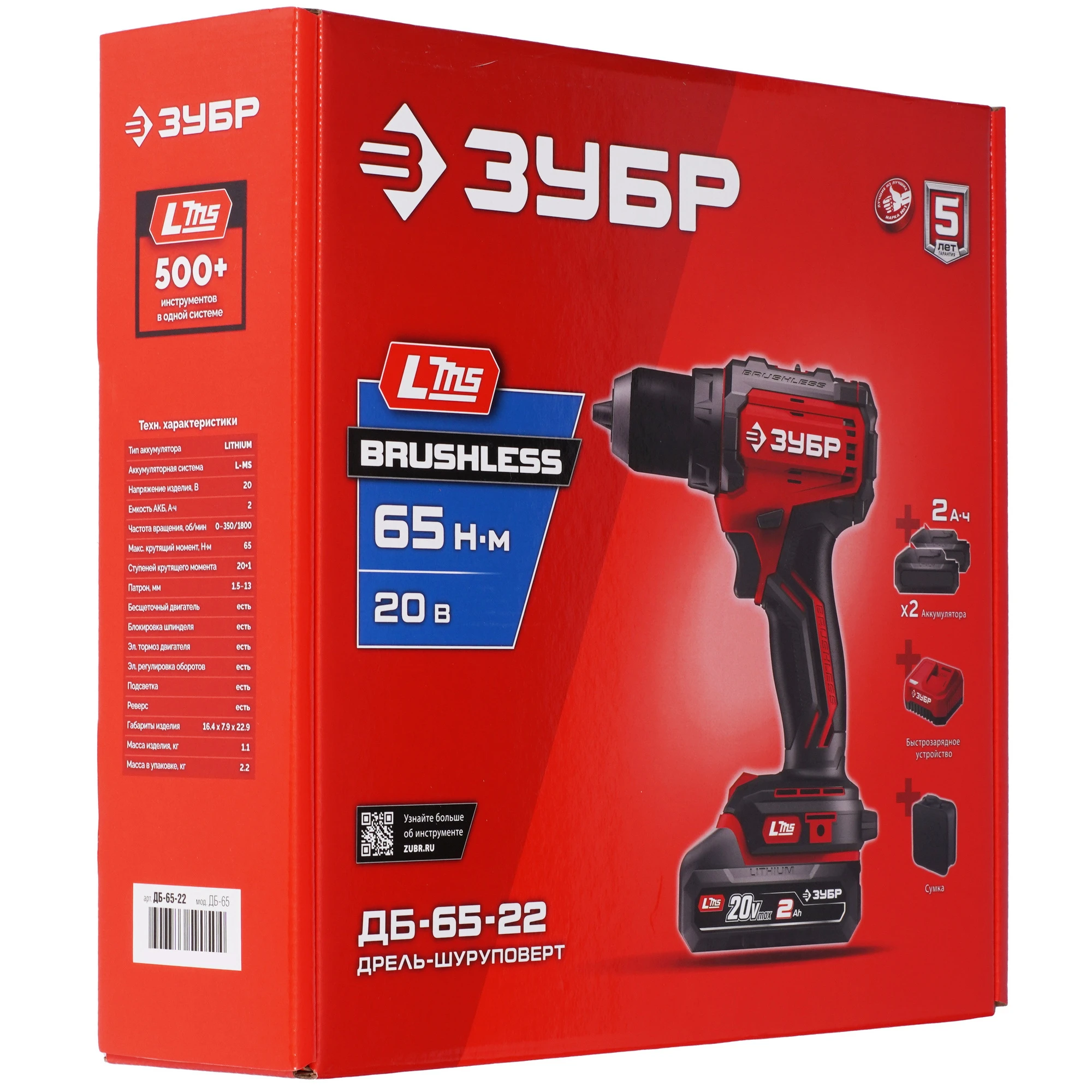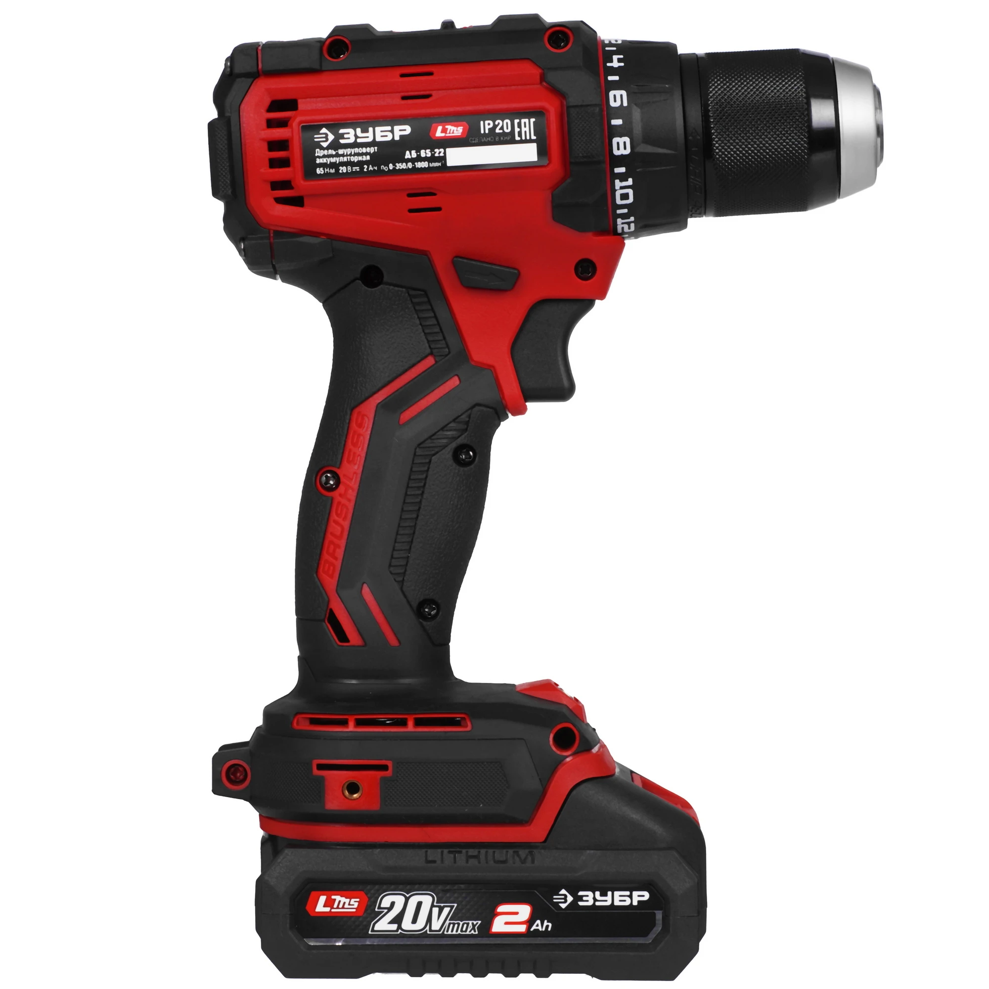 ЗУБР 20 В, 65 Н·м, 2 АКБ LMS (2 А·ч), бесщеточная дрель-шуруповерт, сумка ДБ-65-22 - бесщеточная дрель-шуруповерт ЗУБР системы LMS с увеличенным крутящим моментом предназначена для быстрого заворачивания саморезов до 8 мм диаметром и сверления отверстий до 30 мм в дереве. Длительная работа от одного заряда обеспечивается эффективным двигателем BRUSHLESS. Комплектация с двумя аккумуляторами позволяет работать практически без остановки.