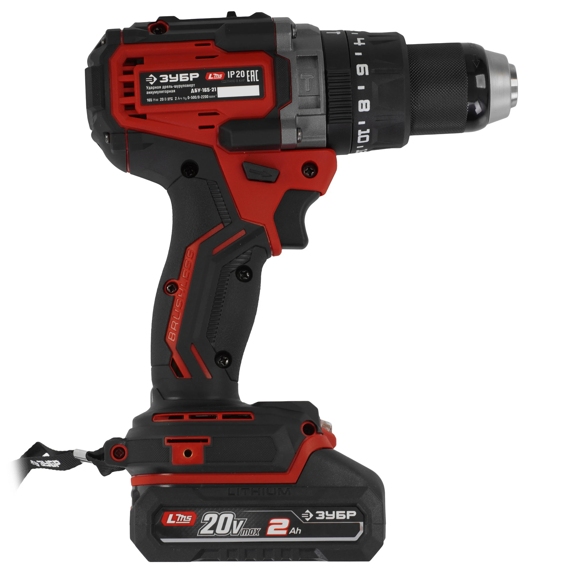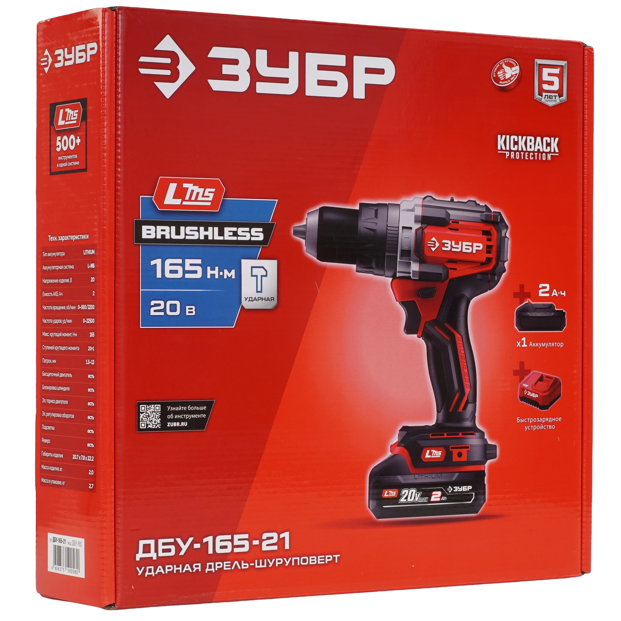 ЗУБР 20 В, 165 Н·м, 1 АКБ LMS (2 А·ч), бесщеточная ударная дрель-шуруповерт ДБУ-165-21 - бесщеточная ударная дрель-шуруповерт ЗУБР системы LMS с увеличенным крутящим моментом предназначена для быстрого заворачивания саморезов до 12 мм диаметром и сверления отверстий до 40 мм в дереве. Длительная работа от одного заряда обеспечивается эффективным двигателем BRUSHLESS. Расширенная функциональность за счет ударного режима работы. Комплектация с аккумулятором позволяет начать работу сразу после покупки.