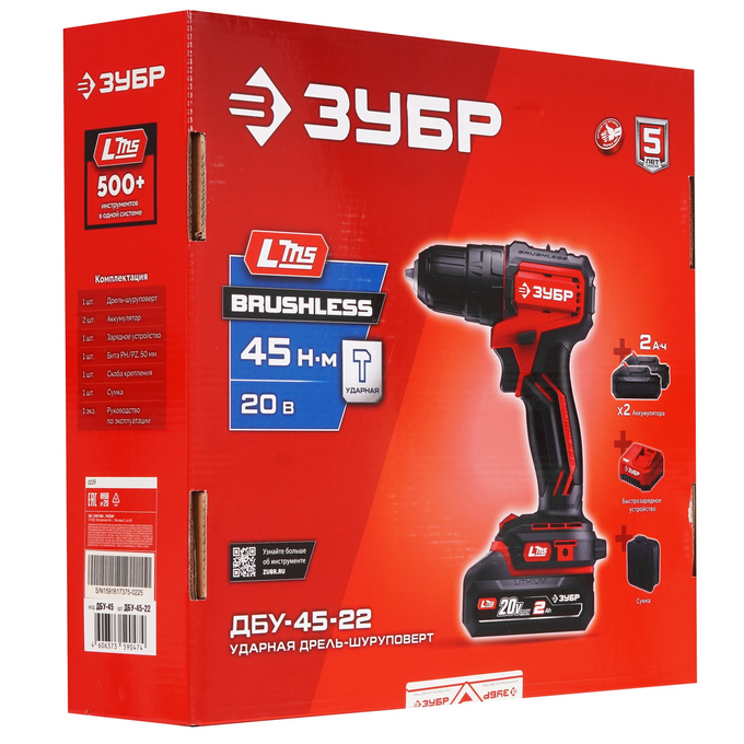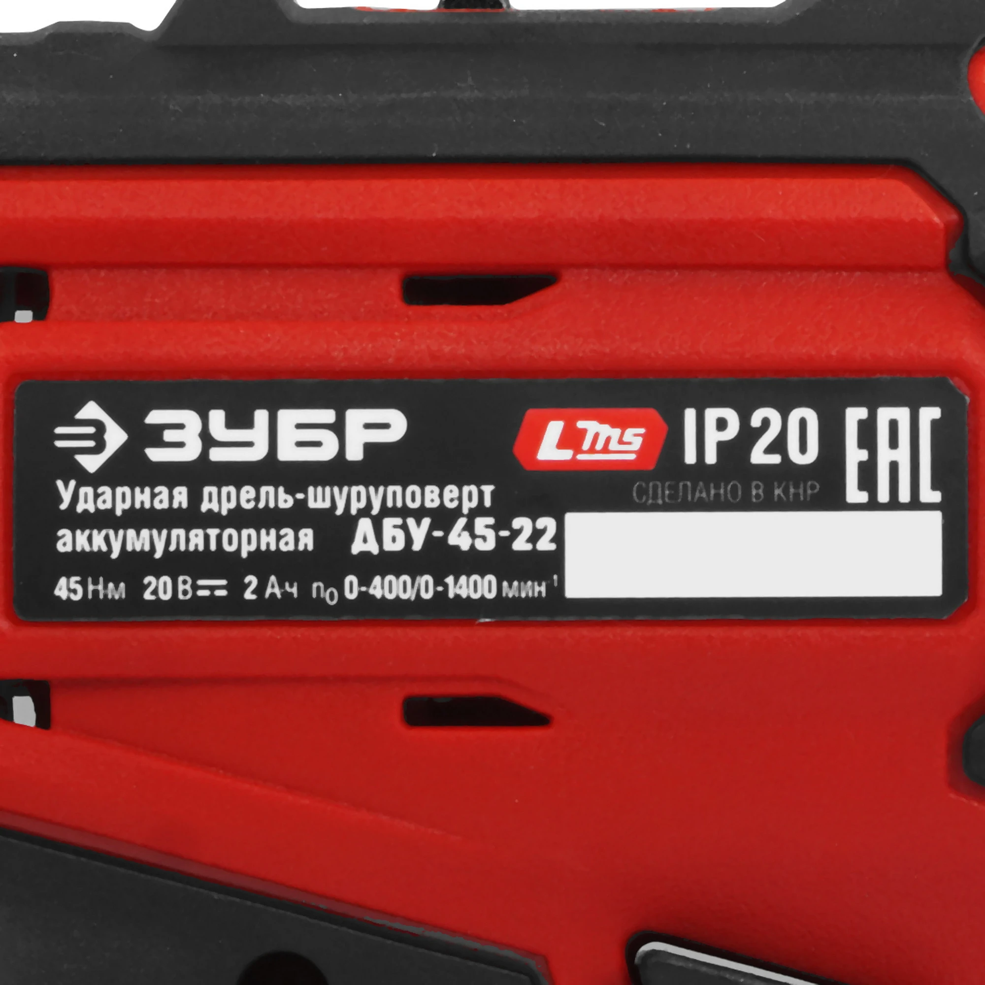 ЗУБР 20 В, 45 Н·м, 2 АКБ LMS (2 А·ч), бесщеточная ударная дрель-шуруповерт, сумка ДБУ-45-22 - инструмент из единой аккумуляторной системы LMS для 500+ инструментов.