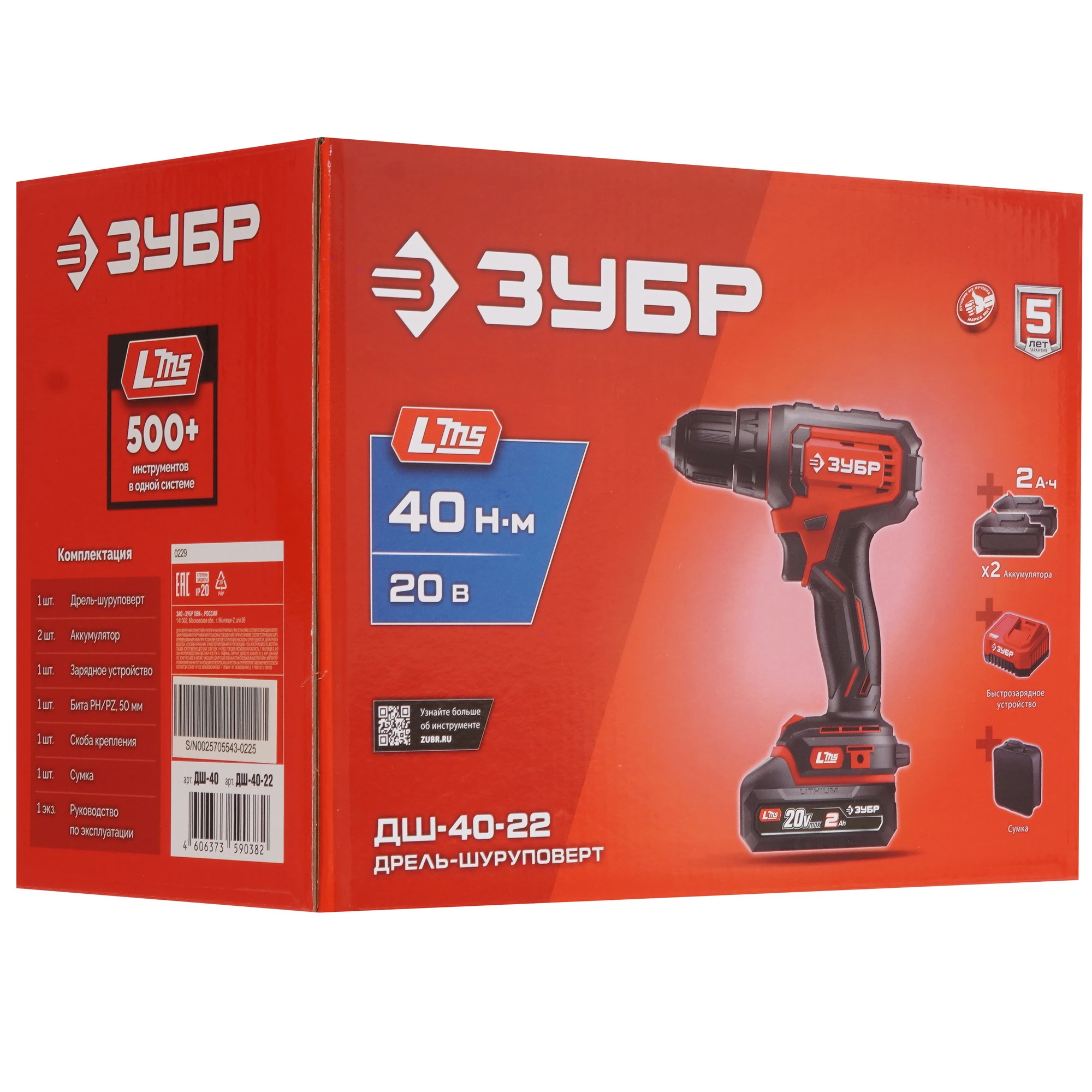 ЗУБР 20 В, 40 Н·м, 2 АКБ LMS (2 А·ч), дрель-шуруповерт, сумка ДШ-40-22 - инструмент из единой аккумуляторной системы LMS для 500+ инструментов.