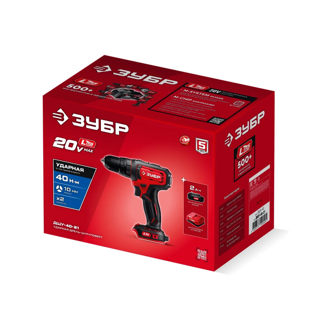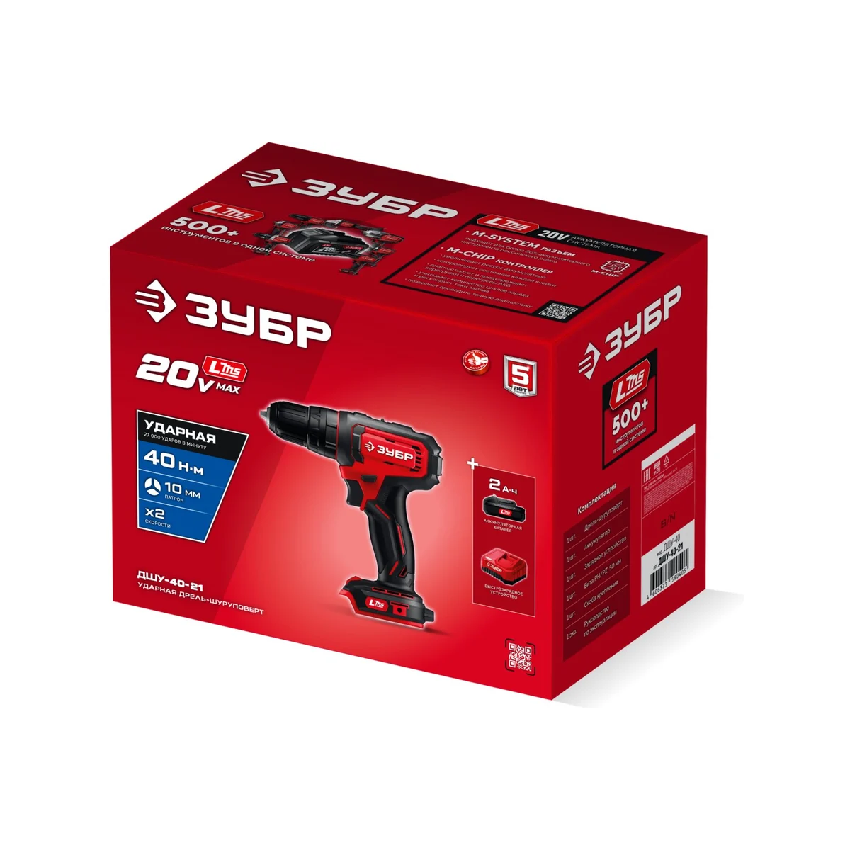 ЗУБР 20 В, 40 Н·м, 1 АКБ LMS (2 А·ч), ударная дрель-шуруповерт ДШУ-40-21 - компактная и недорогая дрель-шуруповерт ударная ЗУБР предназначена для сверления и заворачивания. Эргономичный дизайн, производительный двигатель и настроенная муфта момента позволяет выполнять точный работы легко и без усилий. Комплектация с аккумулятором позволяет начать работу сразу после покупки.