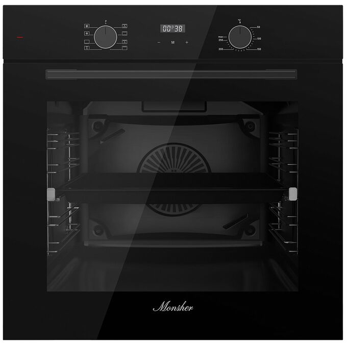 Духовой шкаф MONSHER MOE 6008 Noir 60см, объем 80л, утапливаемые переключатели, механический таймер, 2 стекла в дверце, 8 режимов