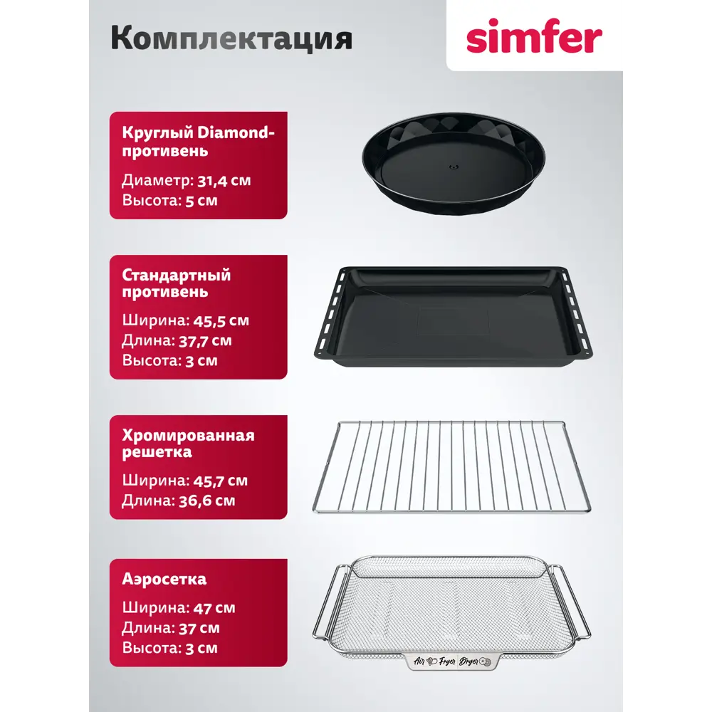 стандартный противень с антипригарным покрытием; хромированная решётка; круглый противень; инструкция по эксплуатации; гарантийный талон