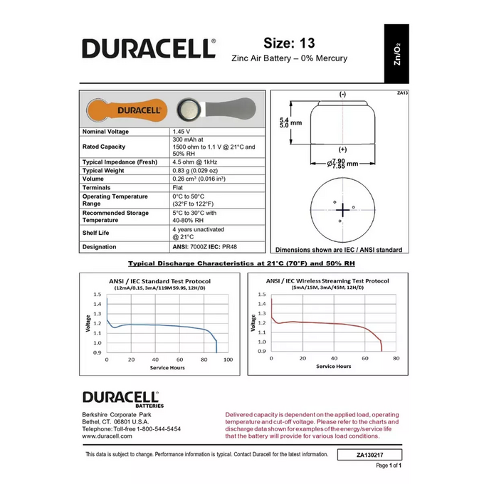 Duracell Activair 13 - специально разработаны для надежной работы в чувствительных слуховых аппаратах. Обладают большой емкостью, не содержат токсичных веществ, имеют длительный срок хранения, поскольку конструкция элемента предусматривает специальную наклейку-ярлычок, исключающую доступ воздуха до момента эксплуатации. Удлиненный защитный ярлычок EasyTab облегчает процесс держания и замены батареек, а легкая упаковка открывается без труда. Батарейки дюрасел для слуховых аппаратов с ярлычком EasyTab различаются по цвету, поэтому выбрать батарейку подходящего размера очень просто. Кроме того, батарейки дюрасел Hearing Aid для слуховых аппаратов сохраняют заряд до 4 лет при хранении в нормальных условиях. Для достижения оптимального результата активированную батарейку в аппарат вставляют не сразу. Нужно дать время активному веществу насытиться кислородом (примерно 5 минут). Если начать эксплуатацию батарейки сразу после снятия защитной пленки, то активация произойдет только в поверхностном слое вещества, что негативно скажется на сроке ее службы.