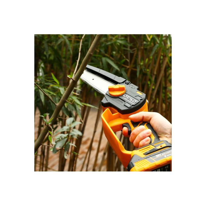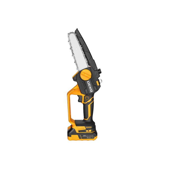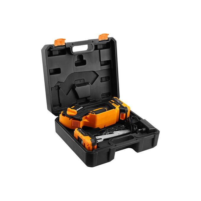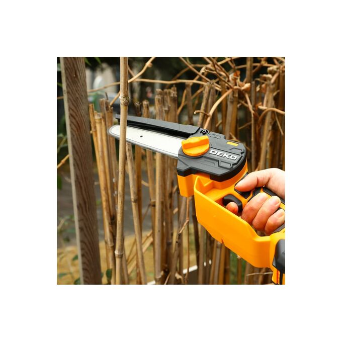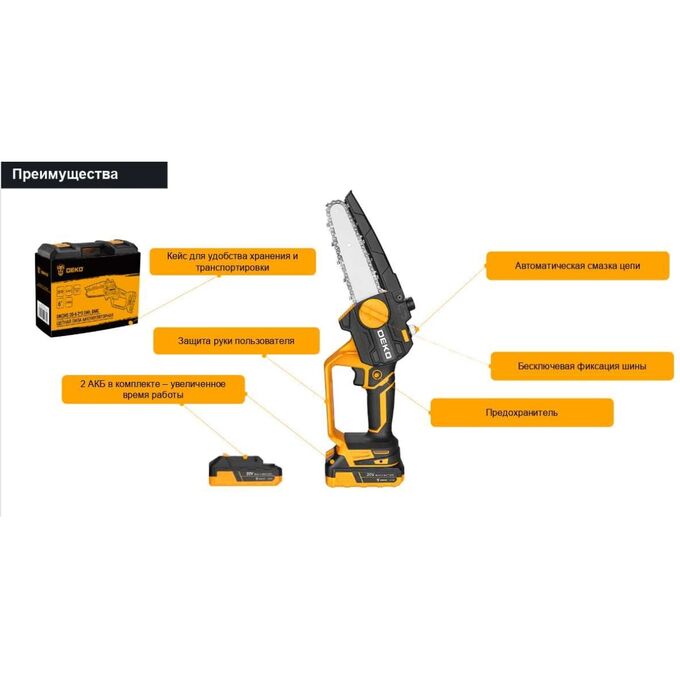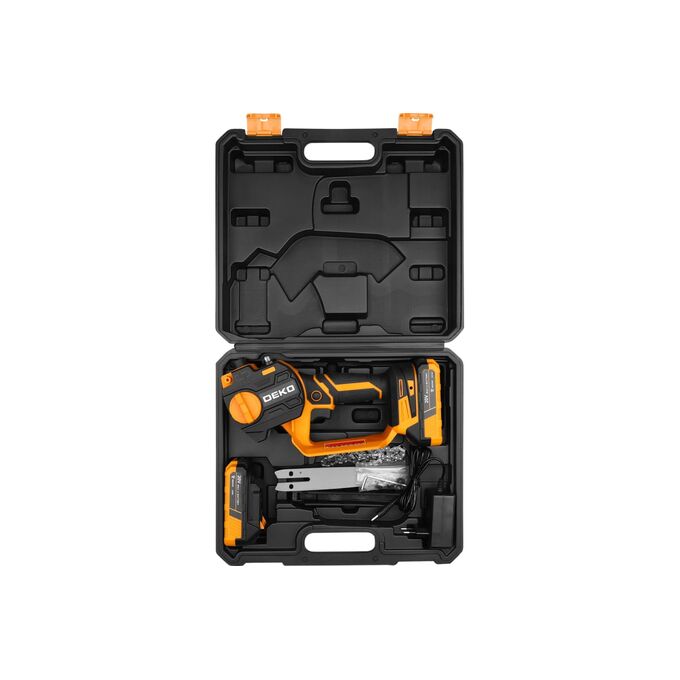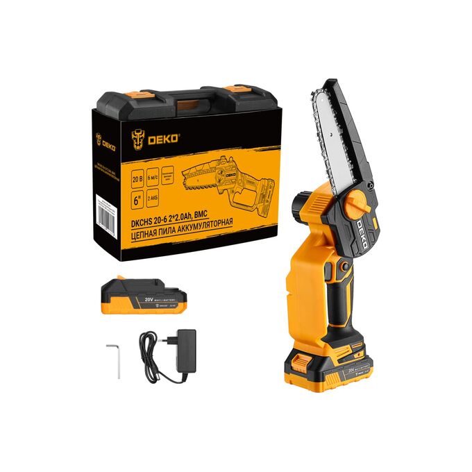 Пила цепная аккумуляторная DEKO DKCHS 20-6, 20В, 2x2.0Ач в кейсе предназначена для пропилов в древесине и пластмассе. Также пила применяется при работе в мастерской или в саду для распиливания различных материалов. Инструмент работает от литий-ионного аккумулятора.