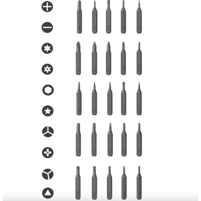 В наборе находятся 25 бит – PH000, PH00, PH0, PH1, PH2, SL1.5, SL2.0, H0.7, H0.9, H1.5, H2.0, T2, T3, T4, T5H, T6H, T8H, T9H,Y10H,P2, P5, Y0.6, W1.5, TW1, 2.2. электрическая отвёртка