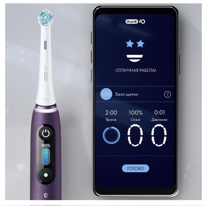 1 ручка iO8, 2 насадки щетки, 1 зарядное устройство, 1 держатель насадки щетки, 1 футляр.