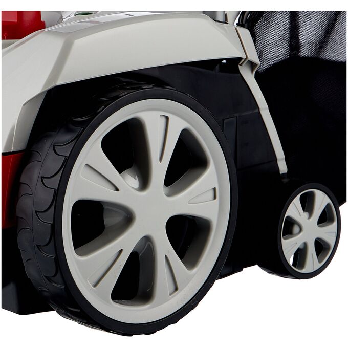 Большие колеса не портят траву, обеспечивая комфортное движение и хорошую проходимость.