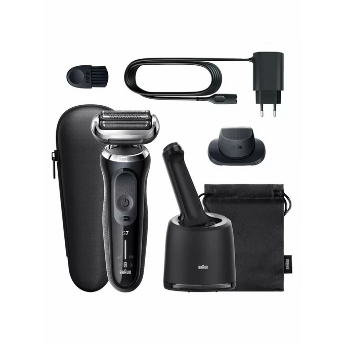Бритва, станция подзарядки, щеточка для очистки, провод для зарядки, насадка-триммер, чехол, дорожный футляр