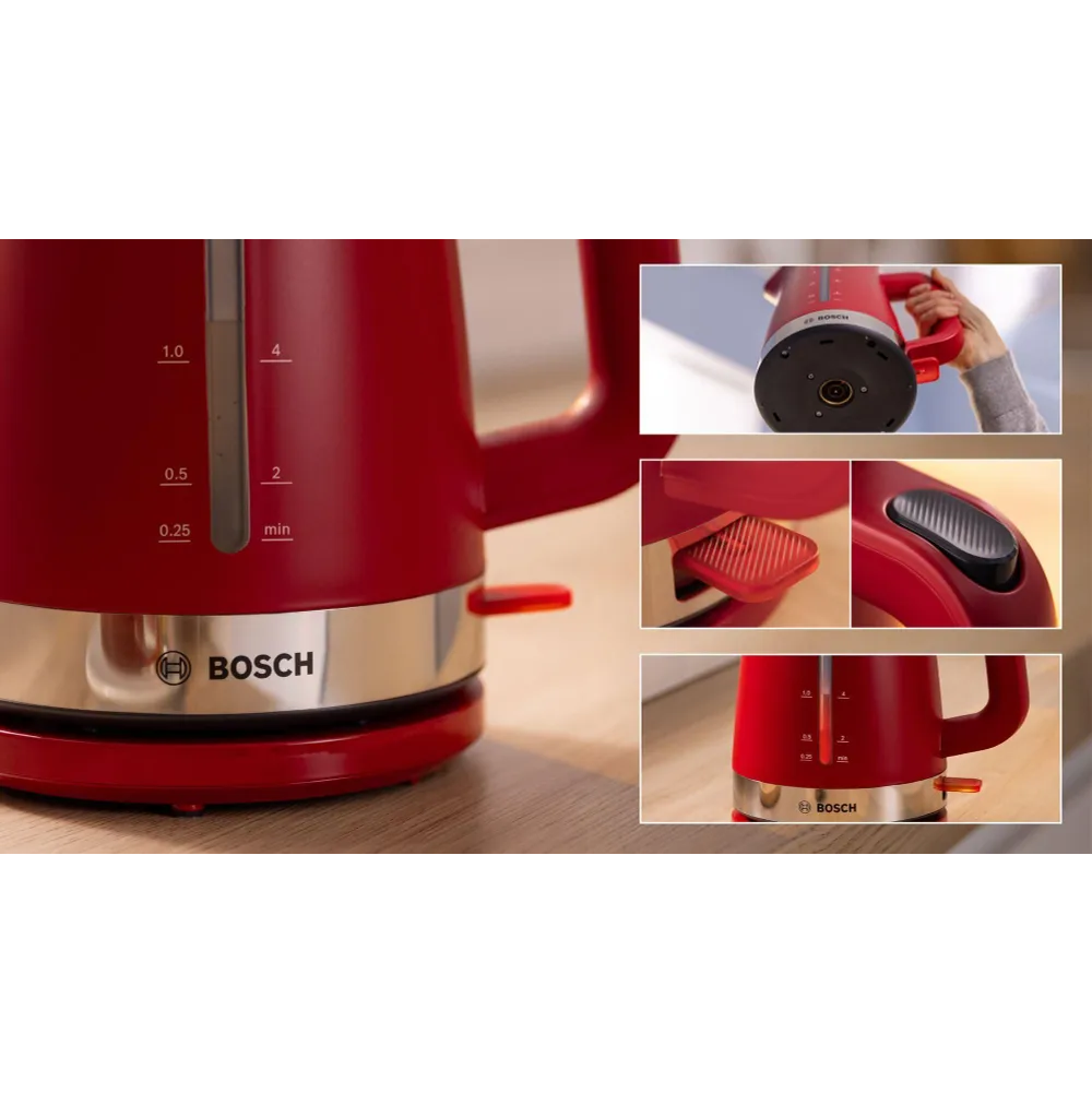 Этот элегантный чайник от Bosch-идеальный выбор для тех, кто ценит не только удобство, но и стильный внешний вид своей кухонной техники. Емкость 1,7 литра позволяет готовить большое количество жидкости, что особенно полезно во время больших собраний или вечеринок. При мощности 2400 Вт вода будет быстро кипеть, а плоский нагреватель обеспечивает равномерный и эффективный нагрев. Красный цвет чайника добавит немного динамики кухне, а нескользящая основа гарантирует безопасное использование прибора. Все эти элементы делают чайник Bosch MyMoment TWK4M224 практичным и эстетичным дополнением к любой кухне.