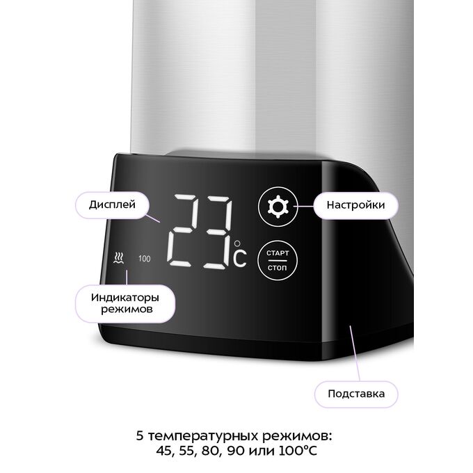 Кнопка «Старт/Стоп» включает и выключает чайник. Кнопка «Настройки» предназначена для выбора температурного режима: 45, 55, 80, 90 или 100°C, что очень удобно при заваривании различных сортов чая или детского питания.