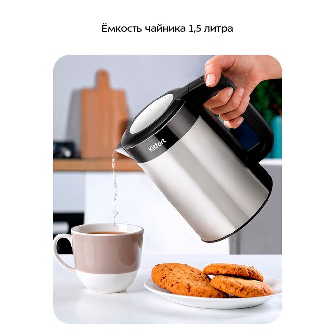 Электрический чайник Kitfort КТ-6691 предназначен для кипячения воды дома, в офисе, на даче. Ёмкость чайника 1,5 литра: этого хватит, чтобы приготовить горячие напитки на большую семью. Полный чайник закипает за 7-8 минут.