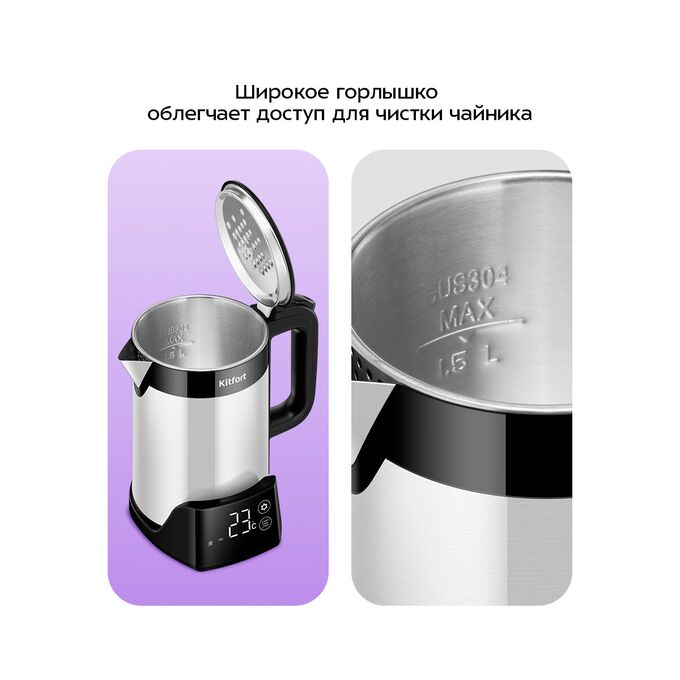 Чайник КТ-6691 оснащён функцией поддержания температуры в течение 6 часов после нагрева или кипячения воды. Температура воды контролируется встроенным в дно чайника термодатчиком и отображается на дисплее.