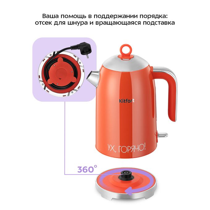 Подставка с центральным контактом позволяет удобно разместить чайник, поворачивая его на 360°. В нижней части подставки имеется специальный отсек для хранения шнура, предотвращая его спутывание и обеспечивая порядок на столе.