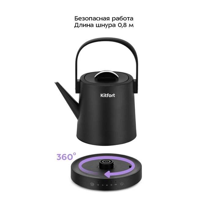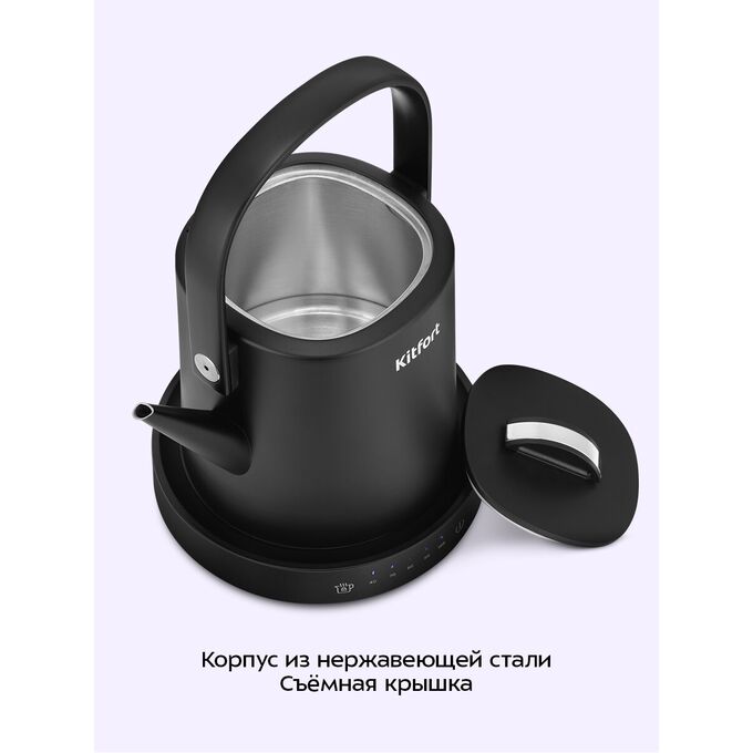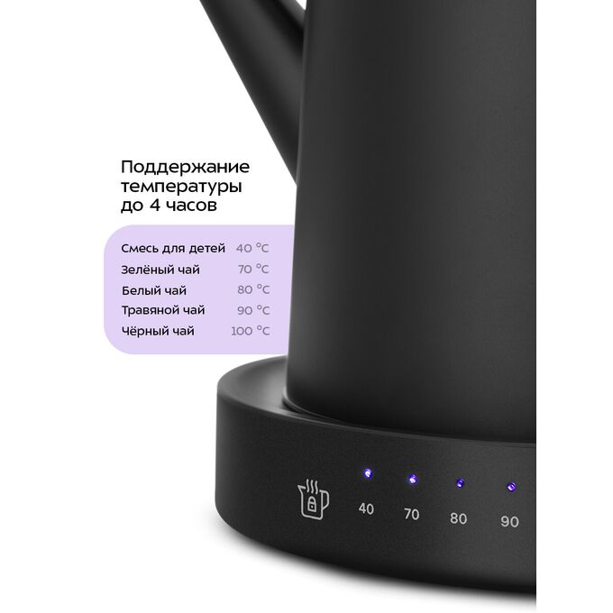 Электрический чайник может не только вскипятить воду, но и нагреть ее до температур: 40, 70, 80 и 90 °С‚ что очень удобно при заваривании различных сортов чая, детского питания и т.д. Чайник также оснащён функцией поддержания температуры.