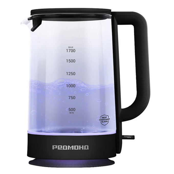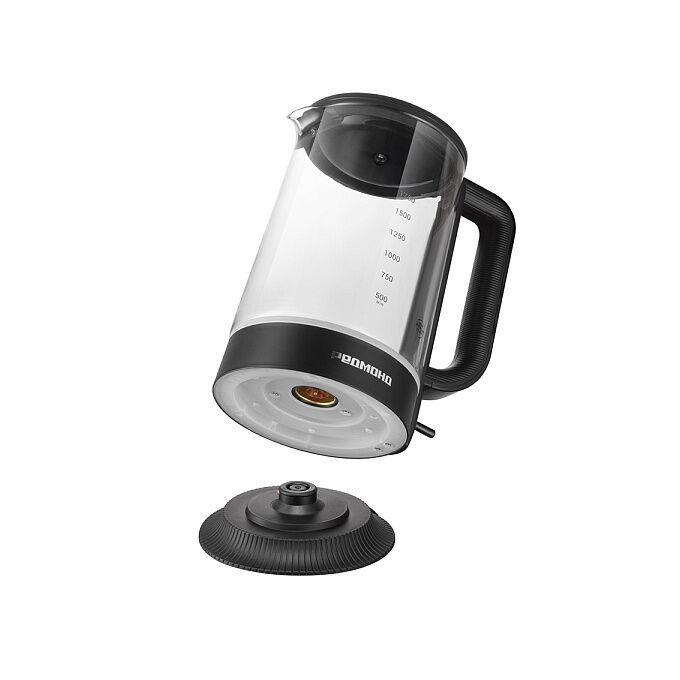 Колба чайника изготовлена из термостойкого стекла. Материал не выделяет вредных примесей, поэтому пользоваться устройством безопасно. Стекло не влияет на вкус воды — напитки получатся идеальными, без запаха пластика