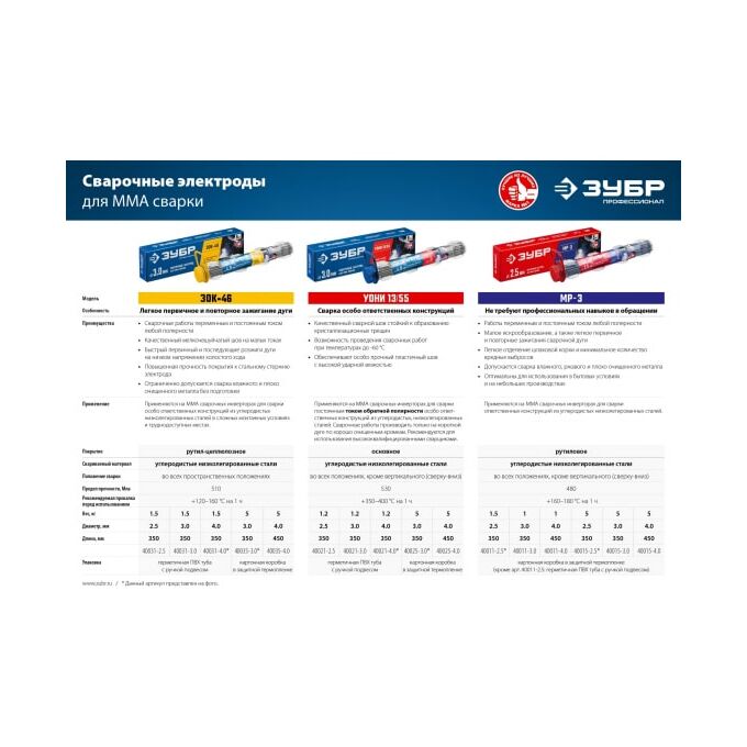 Технические характеристики сварочного электрода ЗУБР 40025-4.0