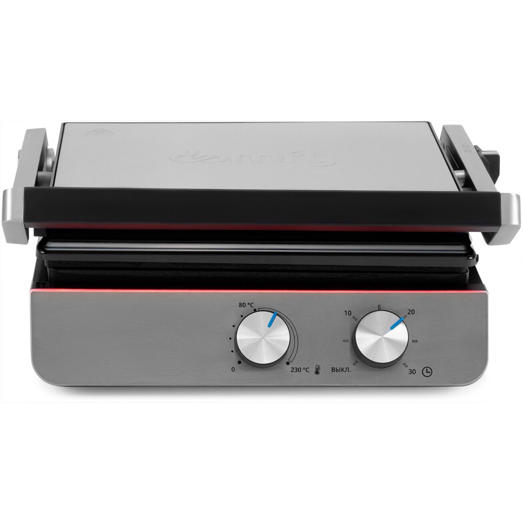 Верхняя крышка имеет «плавающий» фиксатор и адаптирует свое положение под любой продукт с максимальным касанием к панели нагрева.