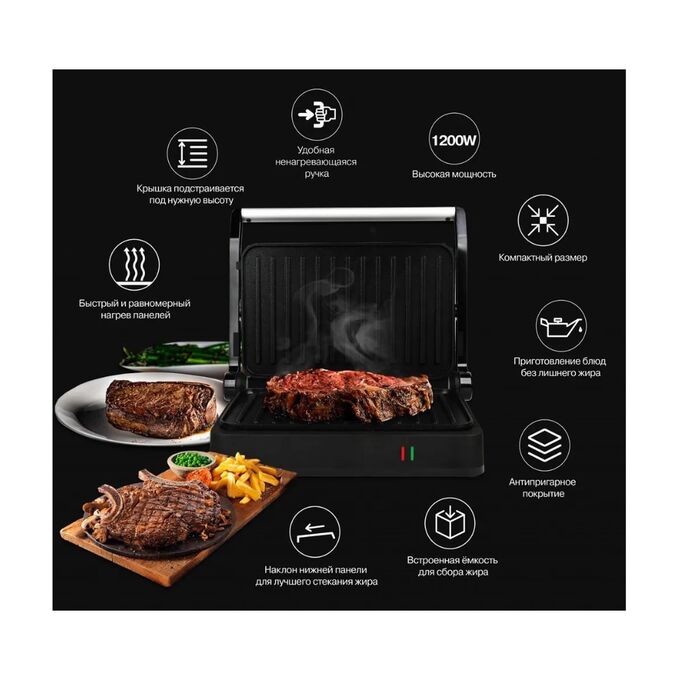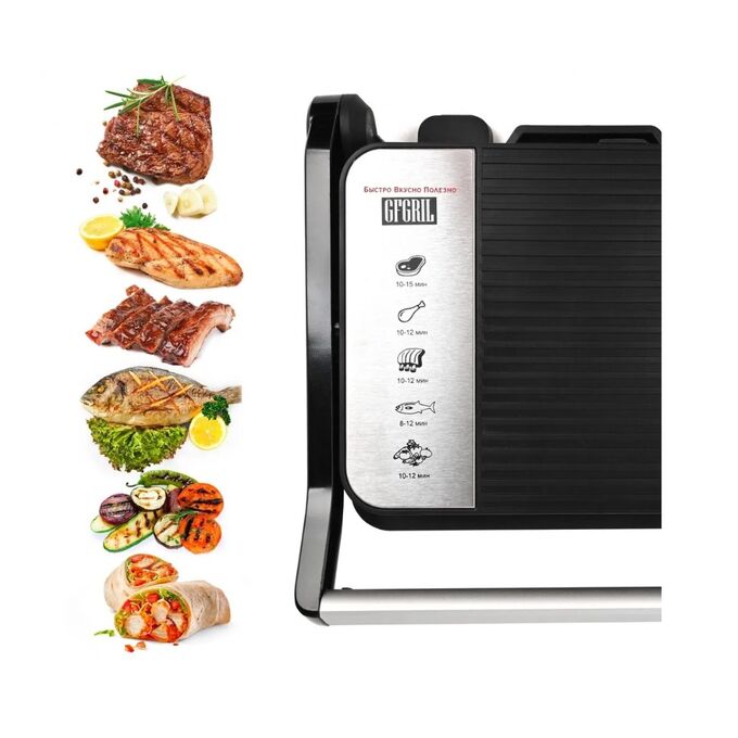 мощный и компактный! Электрический грильGFGRIL GF-012 идеально подходит для приготовления сочных стейков из мяса и рыбы, горячих сэндвичей, нежных овощей-гриль и многих других полезных и вкусных блюд.