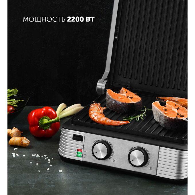 Описание: Технология IQfry встроенный в панель нагревательный элемент. Высокоточный термостат. Раздельная, плавная регулировка температуры верхней и нижней панелей. Возможность использования в открытом положении. Рабочие поверхности раскрываются на 180°.