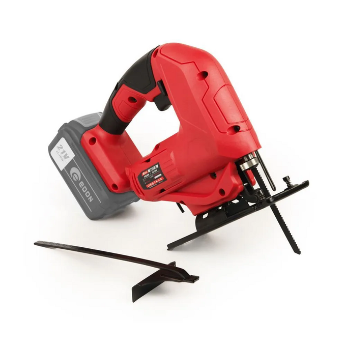 Аккумуляторный лобзик Edon OAF21-JB имеет в комплекте инструмент, ножовочное полотно по дереву и шестигранный ключ.