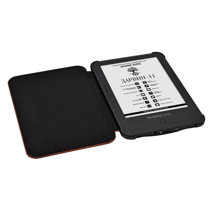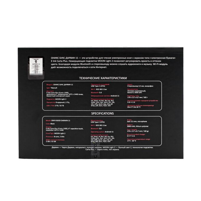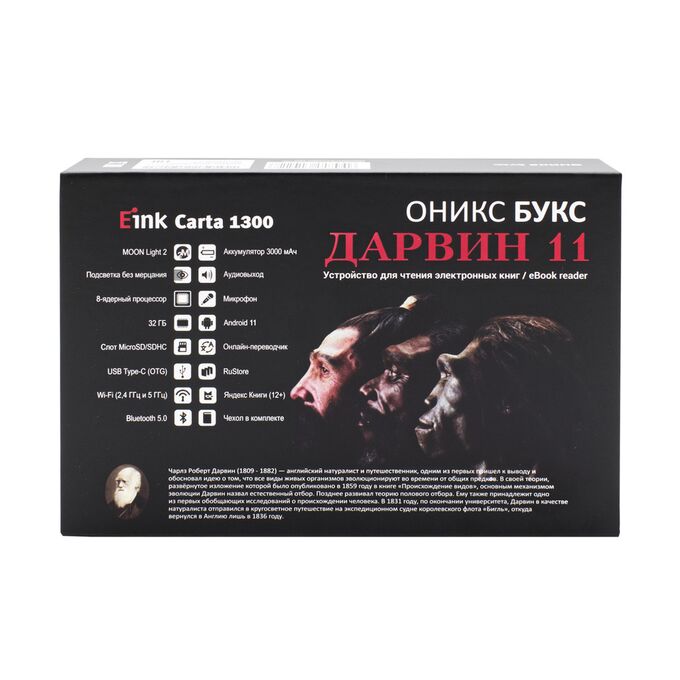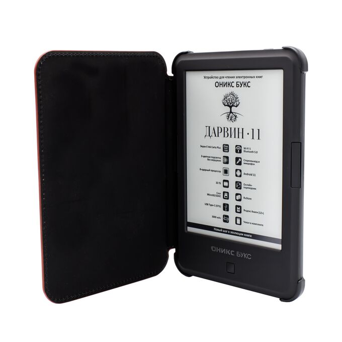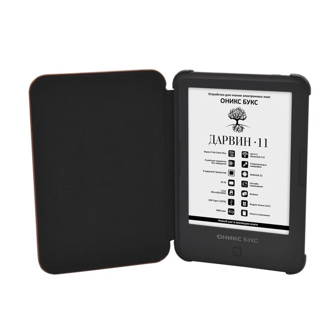 ОНИКС БУКС Дарвин 11 — компактный ридер с 6-дюймовым экраном высокого разрешения E Ink Carta Plus (Carta 1300) с подсветкой и сенсорным управлением. Модель продолжает одну из самых популярных серий производителя и выполнена в классическом корпусе с удобными кнопками управления. Устройство базируется на современном высокопроизводительном процессоре и имеет 2 ГБ оперативной и 32 ГБ встроенной памяти. Ридер оборудован современными модулями Wi-Fi и Bluetooth, а 32 гигабайта встроенной памяти в сочетании со слотом microSD позволяют хранить огромную библиотеку книг и документов на устройстве. Благодаря использованию операционной системы Android 11 на ридер можно устанавливать различные сторонние приложения. В составе ПО имеется магазин приложений RuStore, в каталоге которого представлено более 40 тысяч различных программ. Можно подключить к ридеру наушники или колонку и прослушивать музыку и аудиокниги, а поддержка функции Text-To-Speech позволит озвучить текстовые файлы. На ридере предустановлено множество полезных приложений, включая онлайн библиотеку Яндекс Книги (12+). В комплекте с устройством поставляется «умная» защитная обложка.