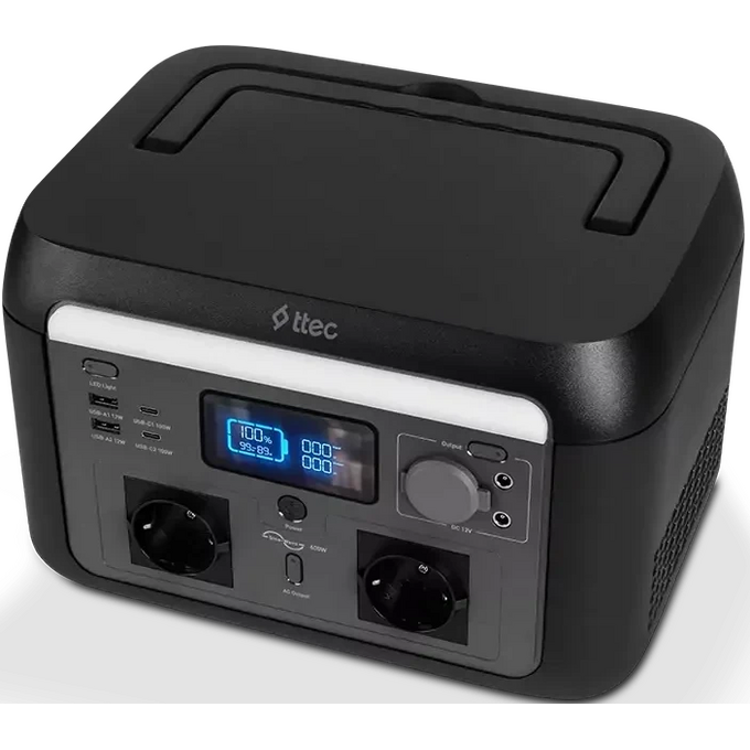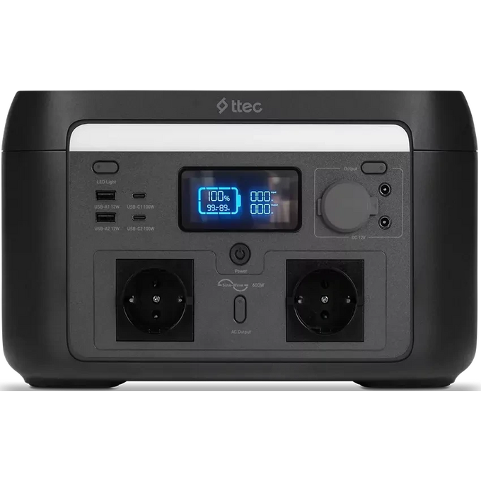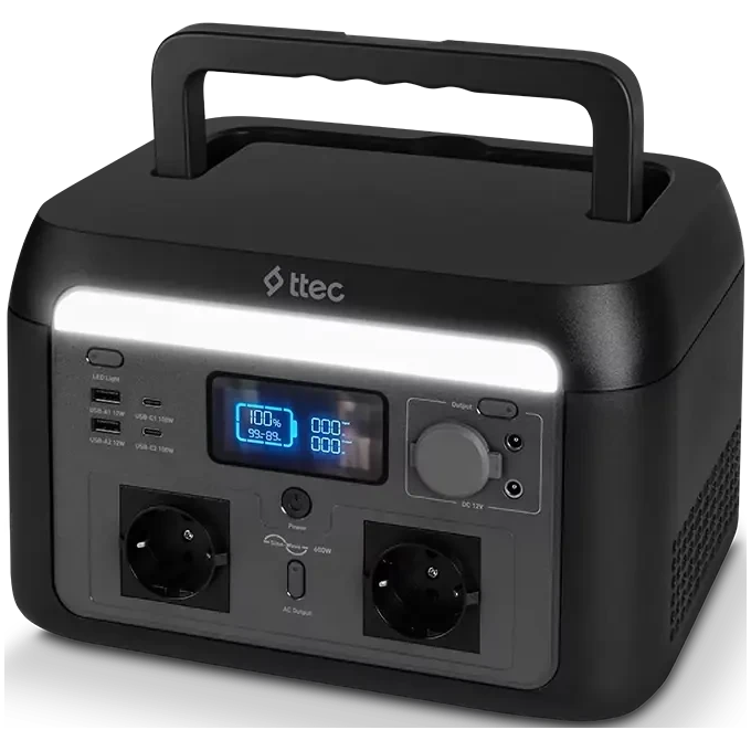Эргономичная ручка делает переноску этой мощной станции невероятно лёгкой, а встроенный яркий светодиодный фонарь осветит вашу площадку в кемпинге, гараж или любое другое место, где это необходимо. Чёрный цвет корпуса подчёркивает её сдержанный и технологичный дизайн. Портативная зарядная станция ttec PowerMax Pro 600W — это не просто аккумулятор, это ваш личный, автономный источник энергии, который гарантирует, что вы всегда останетесь на связи и с комфортом