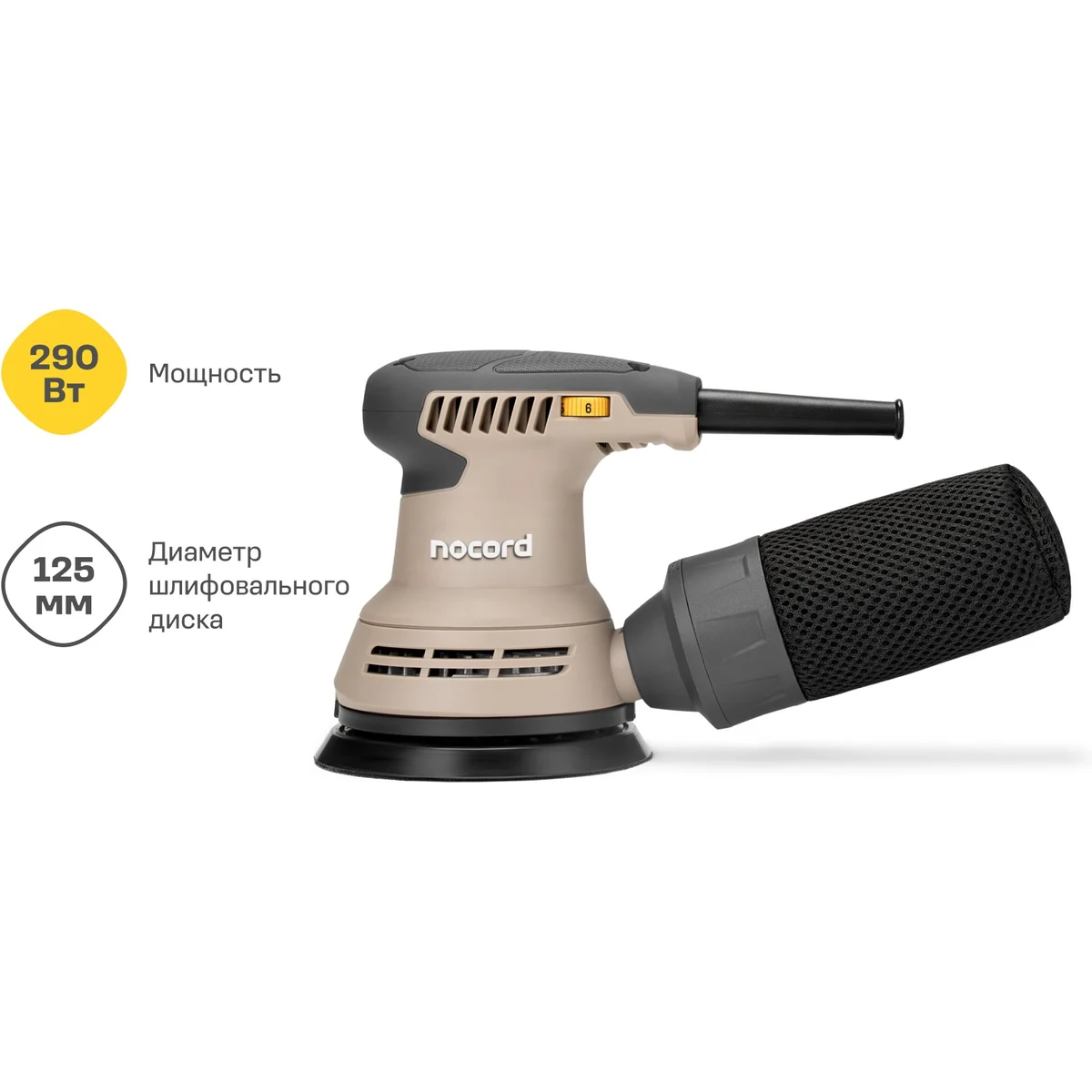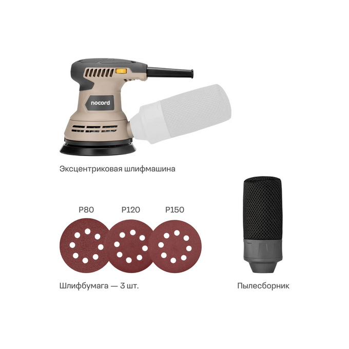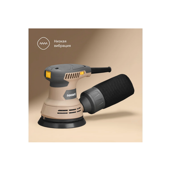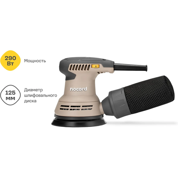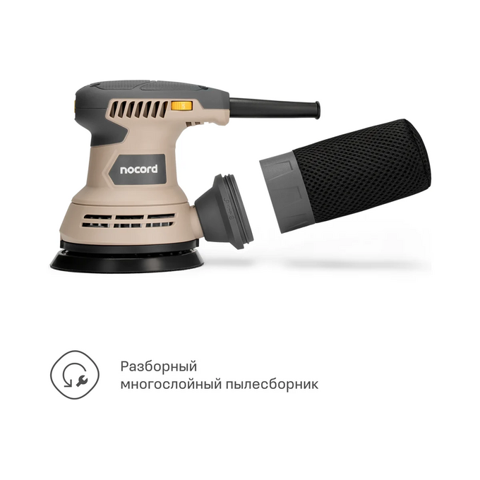 Чтобы избавиться от пыли, можно использовать встроенный контейнер, который легко очистить, или подключить шланг пылесоса. 3-метровый кабель удобно использовать с пылесосами Nocord. Распространённый размер шлифкруга (125 мм) упростит подбор расходных материалов. Насадки просто и быстро заменить — они крепятся на липучки Velcro.