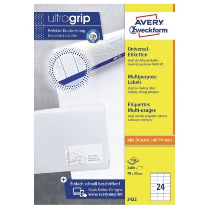 Этикетки Avery Zweckform 3422 A4 70x35мм 24шт на листе/70г/м2/100л./белый матовое самоклей. универсальная