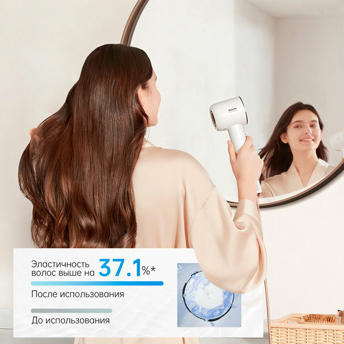 защита от перегрева, съемный фильтр, 2 скорости. Дополнительные режимы: ионизация, Быстрая сушка за 3 минуты, Встроенный генератор ионов, Сверхлегкий корпус, Система поддержания температуры 57°C, Снижение шума, быстрая сушка за 3 минуты, холодный воздух