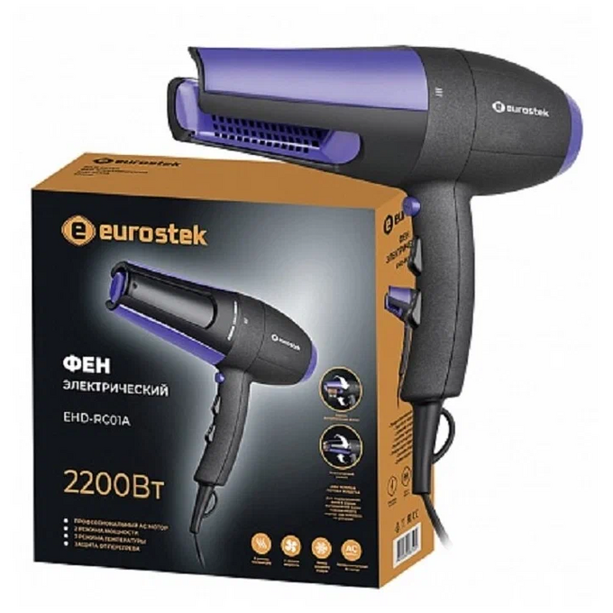Фен электрический EHD-RC01A. Оснащен профессиональный AC мотором. Имеет 2 режима мощности воздушного потока, 3 температурных режима, режим холодного воздуха, петельку для подвешивания, съемную решетку воздухозаборных отверстий, защиту от перегрева. Длина сетевого шнура составляет 1,8 м. Самой главной особенностью является отсутствие насадок за счет механизма, приводящего фен к работе. Чтобы начать работу с феном необходимо повернуть корпус в сторону и по завершении работы повернуть корпус в противоположную сторону.