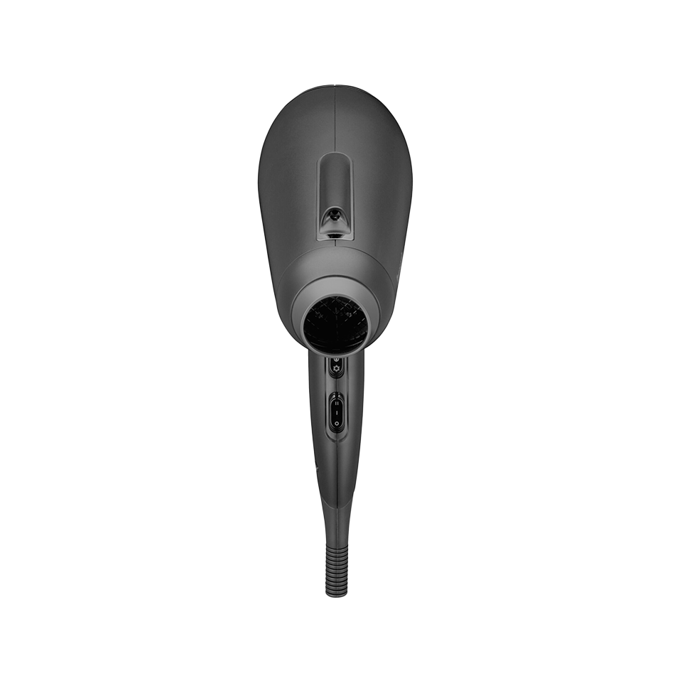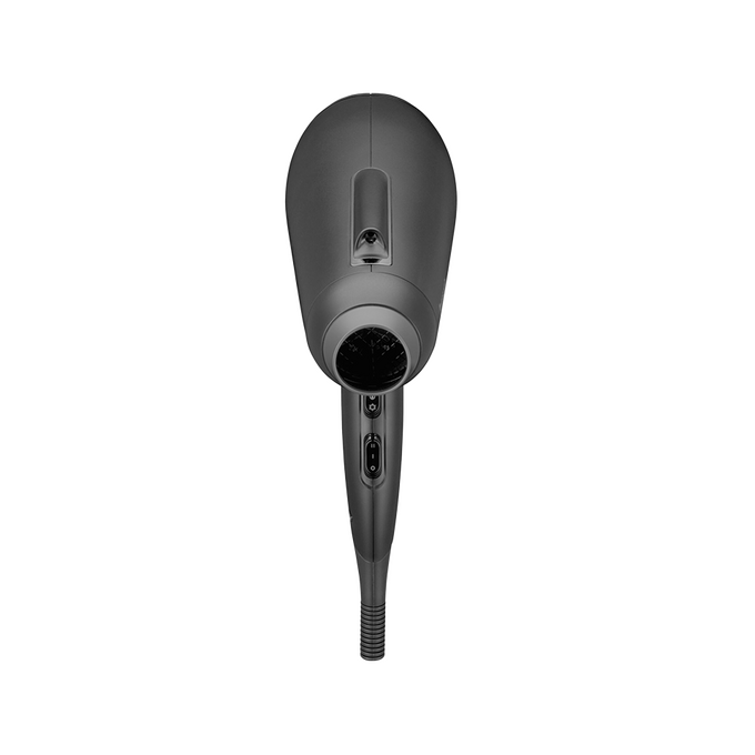 Внешний вид фена отличается лаконичным и современным дизайном. Он выполнен в черном матовом цвете, имеет гладкую пластиковую поверхность и эргономичную форму с расположенными на корпусе кнопками и вентиляционными отверстиями