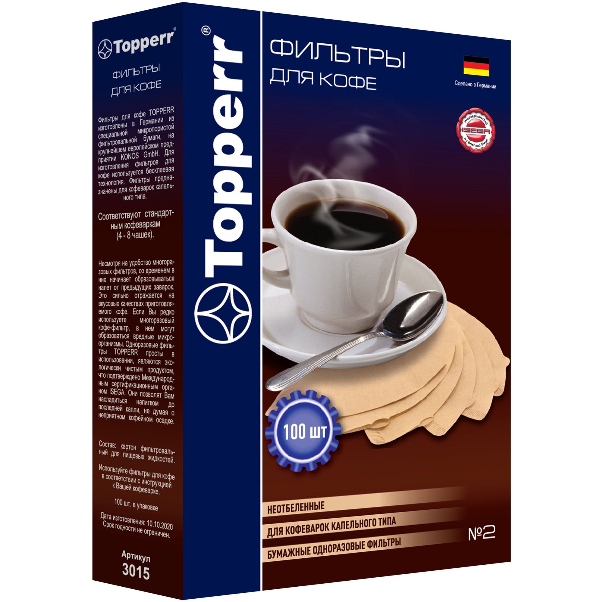 Бумажные одноразовые фильтры для кофе №2 (100шт.) НЕОТБЕЛЕНЫЕ Фильтры для кофе TOPPERR® изготовлены из специальной фильтровальной бумаги, произведенной в Германии, крупнейшей фабрикой Европы KONOS GmbH. Фильтры предназначены для маленьких кофеварок капельного типа.