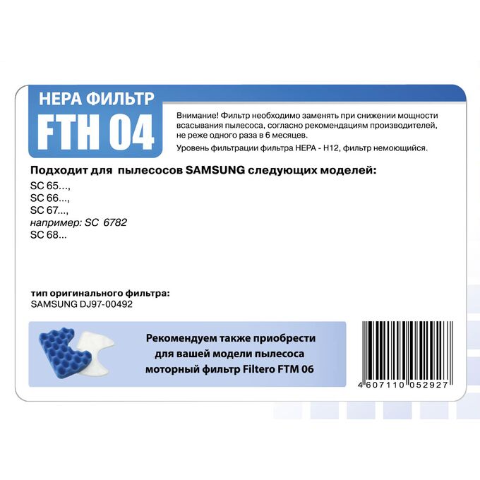Фильтр Filtero FTH 04 уровня фильтрации НЕРА Н 12.