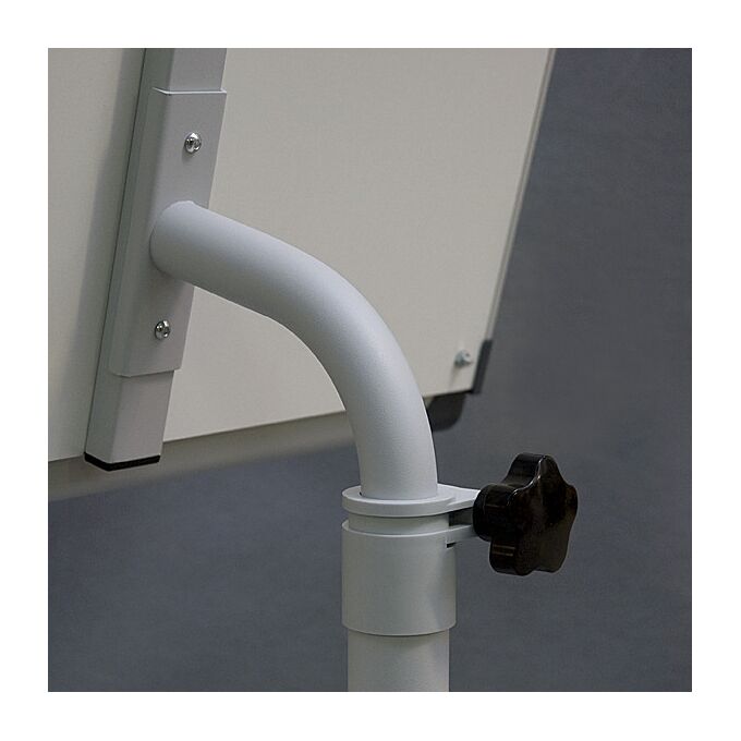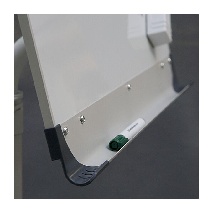 Описание: Сухостираемая доска в алюминиевой рамке. База на 5 колесах (3 c блокировкой). Столб из стали, с регулировкой высоты (175–195 см). Универсальный держатель для блокнотов (регулируемое расстояние между крючками). Полка-желоб на маркеры. Отделка из пластмассы в графитовом цвете.
