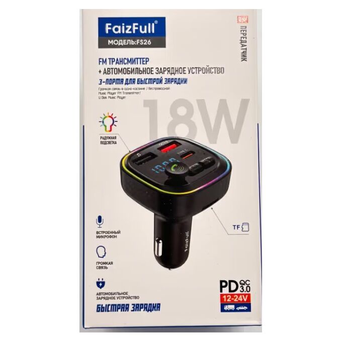 FM модулятор+АЗУ FaizFull FS26 3.0A, 18W Bluetooth 5.0+EDR USB-C