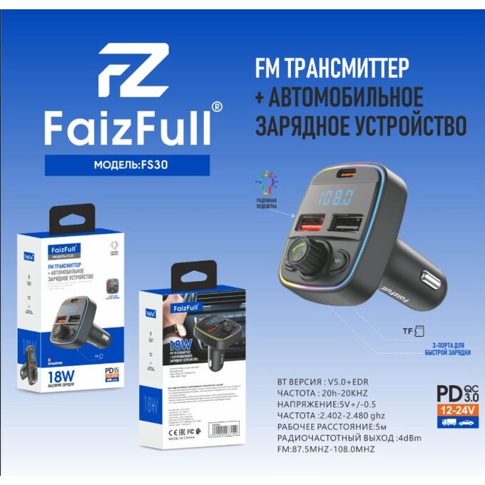 FM модулятор+АЗУ FaizFull FS30 3.0A, 18W Bluetooth 5.0+EDR USB-C