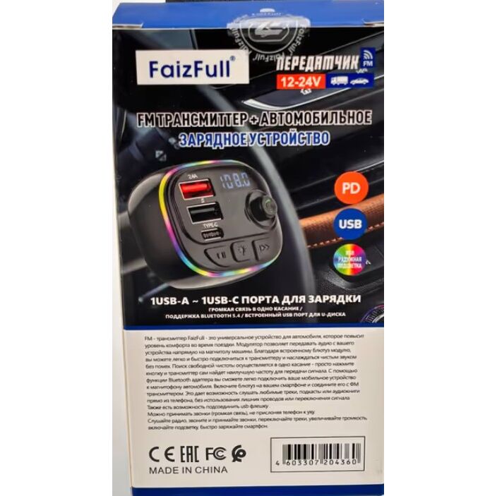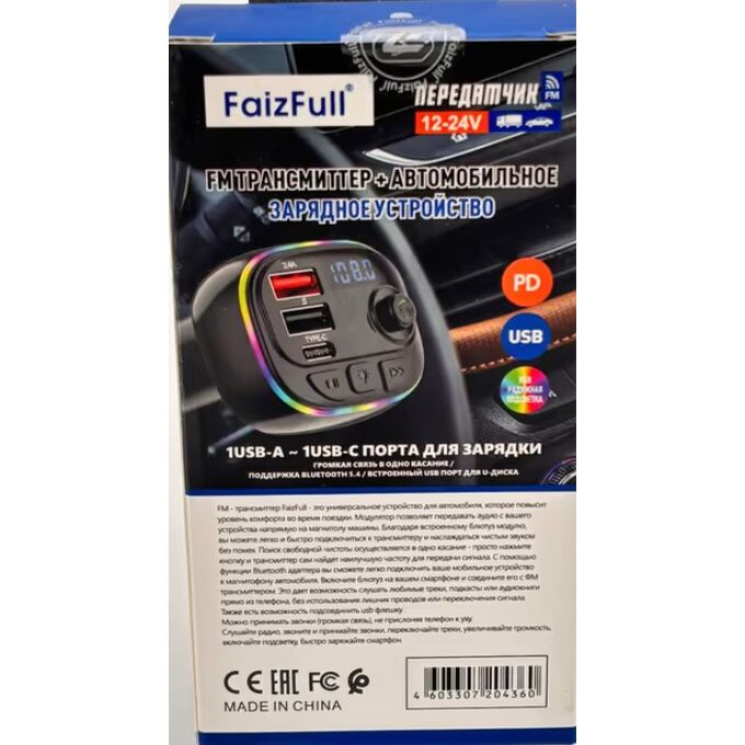 FM модулятор+АЗУ FaizFull FS42 12-24V 2,4A Bluetooth 5.4+EDR RGB встроенный микрофон