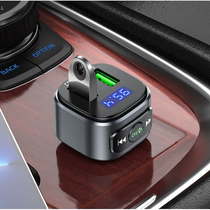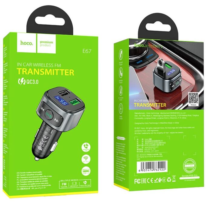 E67 Fighter - FM-трансмиттер и автомобильное зарядное устройство, c двумя выходами USB - стандартным (5V, 1.5A) и с функцией быстрой зарядки QC3/0 18W. Поддерживает проигрывание музыки с USB-флешки и по Bluetooth. Мобильный телефон подключается к трансмиттеру через Bluetooth, трансмиттер подключается к автомобильному динамику через FM. Есть LED дисплей и встроенный микрофон, управление производится с помощью встроенного пульта. Поддержка карт памяти до 32 ГБ, форматов аудиофайлов MP3, WAV, WMA.