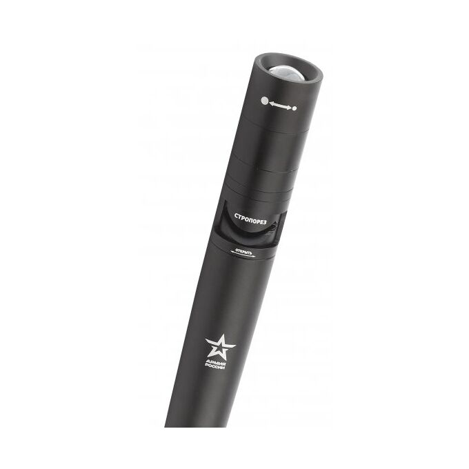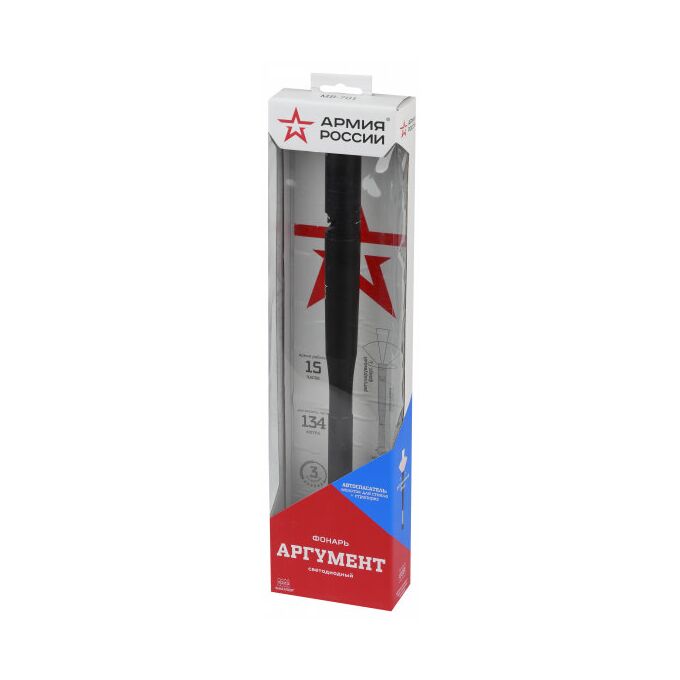 Особая конструкция и прочность корпуса позволяют применять ЭРА Армия России Аргумент для самозащиты. Фонарь упакован в картонную подарочную коробку в узнаваемой стилистике бренда "Армия России". Фирменная звезда "Армия России" - и на корпусе самого фонаря.
